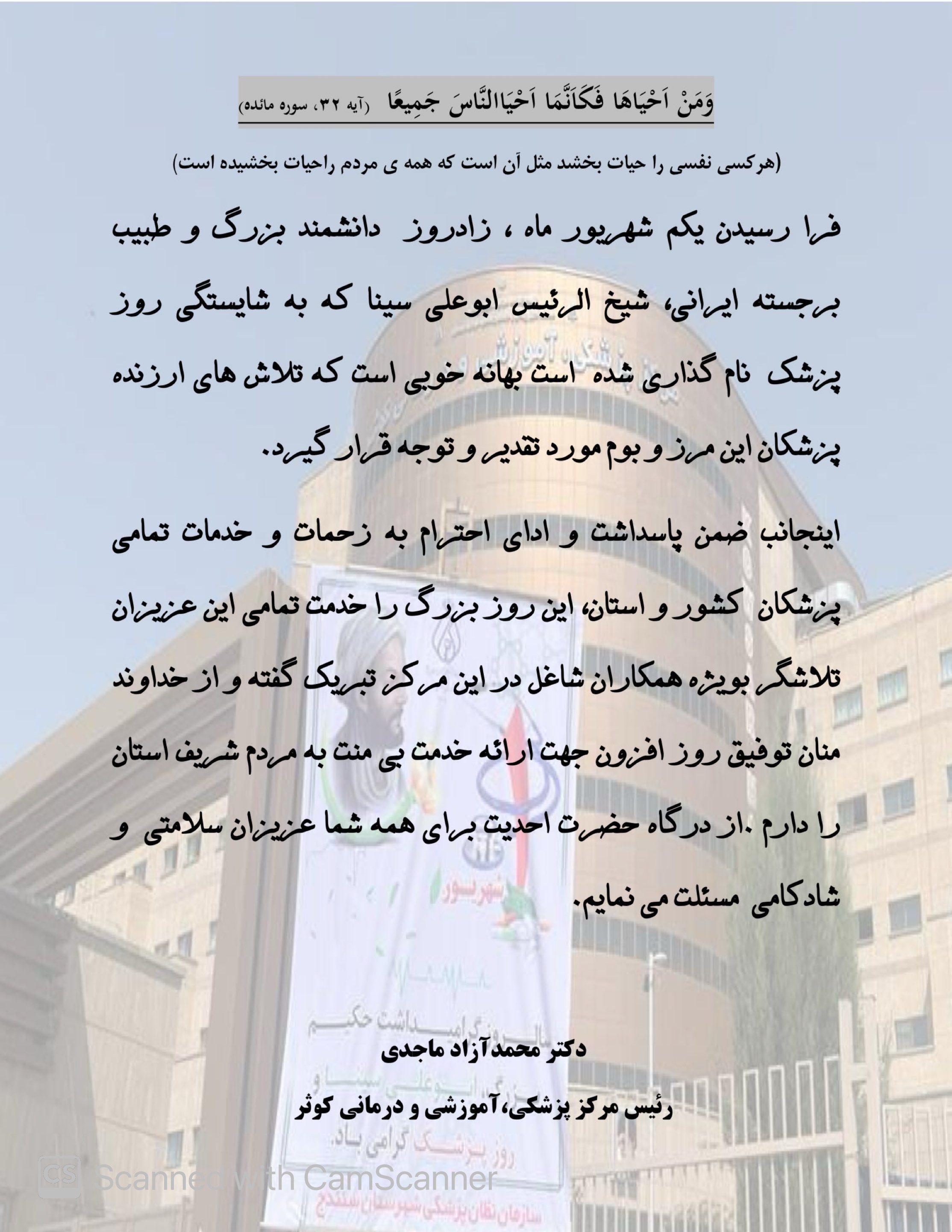 پیام تبریک ریاست مرکز به مناسبت فرارسیدن روز پزشک