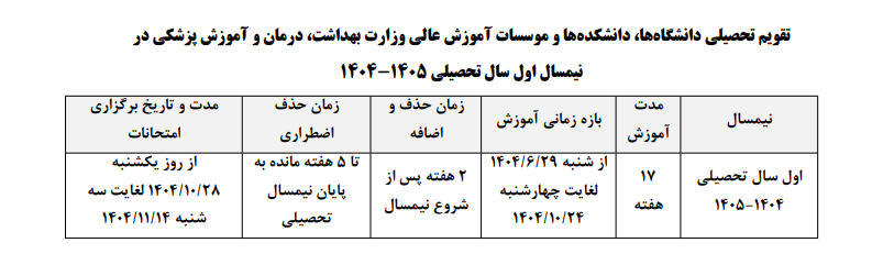 تقویم تحصیلی نیمسال اول سال تحصیلی 1405-1404 دانشجویان جدیدالورود