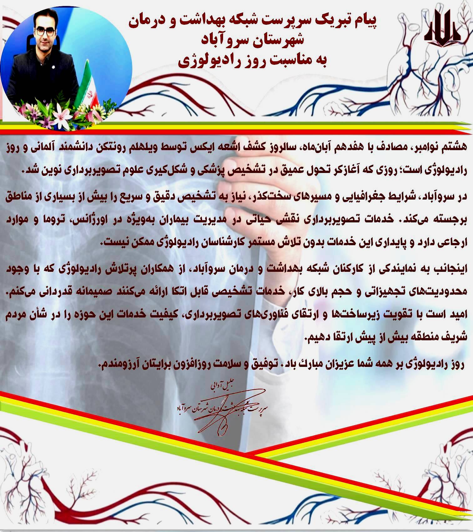جلیل آدابی مدیر شبکه بهداشت و درمان شهرستان سروآباد به مناسبت روز جهانی رادیولوژی پیام تبریکی منتشر کردند