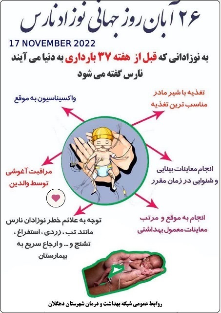 هرساله 26 آبان (17 نوامبر) ،به عنوان روز جهانی نوزاد نارس گرامی داشته می شود .این روزباهدف افزایش آگاهی درباره ی چالش ها ونیاز های نوزادان نارس و خانواده های آنان بر گزارمی شود .روز جهانی نوزاد نارس یاد آور اهمیت حمایت از کوچکترین وآسیب پذیرترین اعضای جامعه است .باتوجه به اهمیت مراقبت های اولیه مانند تماس پوست با پوست ومراقبت های تخصصی می توان به بهبود زندگی این نوزادان کمک کرد .
