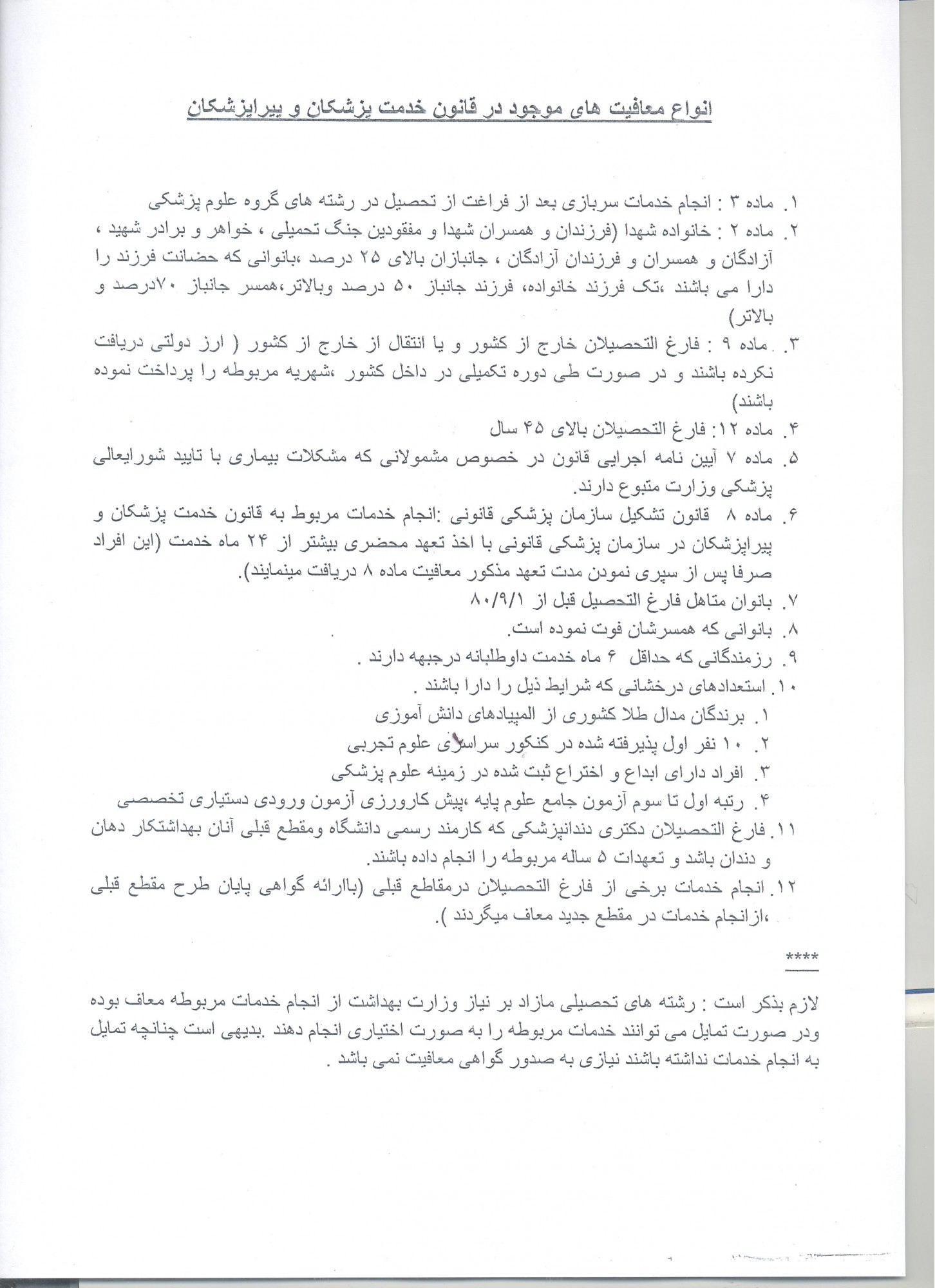 برای مشاهده قوانین خدمت پزشکان و پیراپزشکان اینجا کلیک کنید.